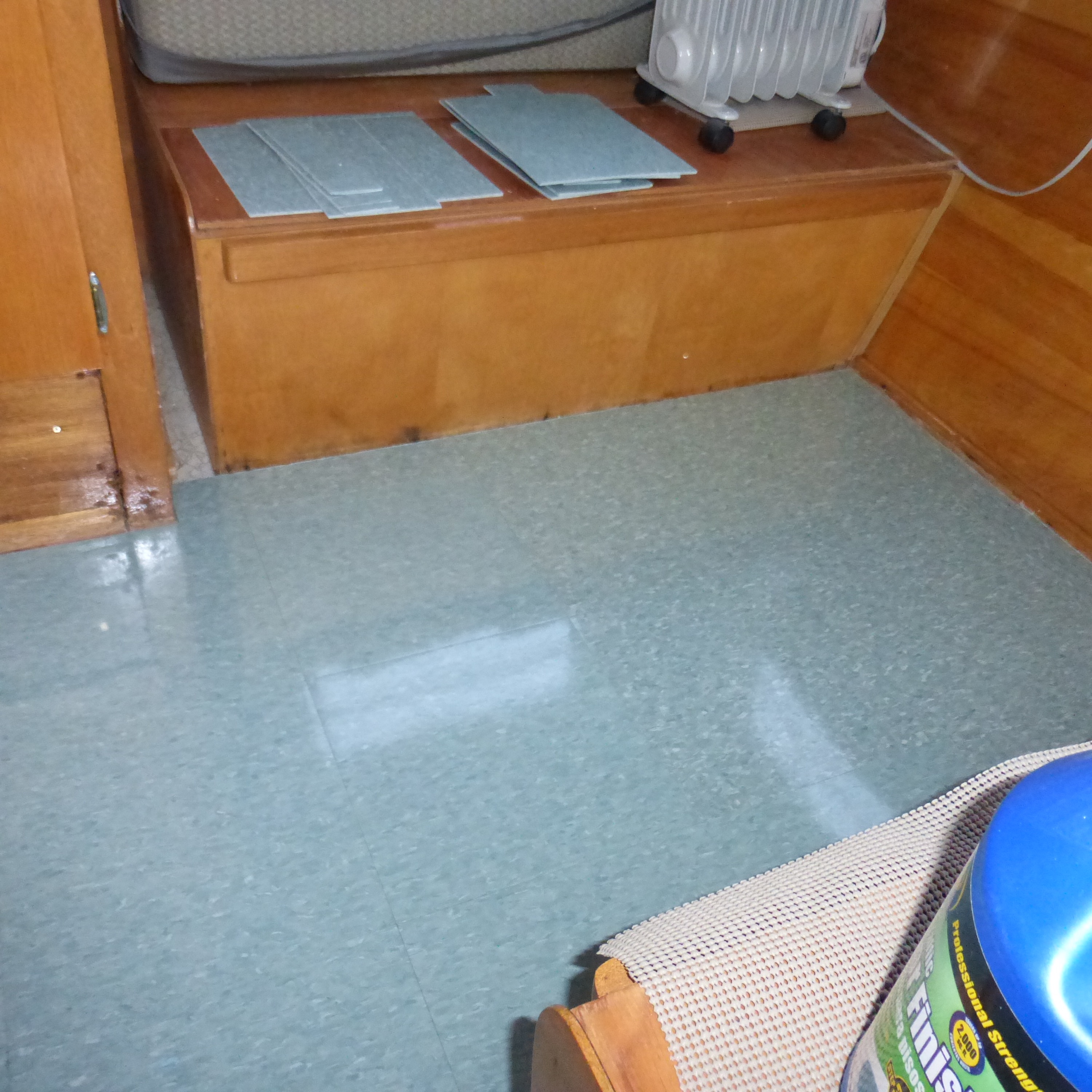 Apply floor polish. We use ZEP. IT is available at Home Depot and Lowes. It says to apply with a rayon, non shedding string mop. We have done it that way before, but honestly, they are a mess and a pain in the butt. I use a Swiffer type floor mop with a non shedding pad. You apply several thin coats, letting it dry for 30 to 60 minutes between coats. I applied four coats, buffed, 2 more coats, buffed. Be very sure your floor is clean and free of lint, dust, or hairs. All that crap will get sealed in the floor polish and you will be miserable every time you see it. Again, ask me how I know.  You may be tempted to just leave the VCT tiles without polishing.  After all, it looks great!  Be aware, though, VCT tiles will stain and are somewhat porous.  The polish protects against scratches and stains.