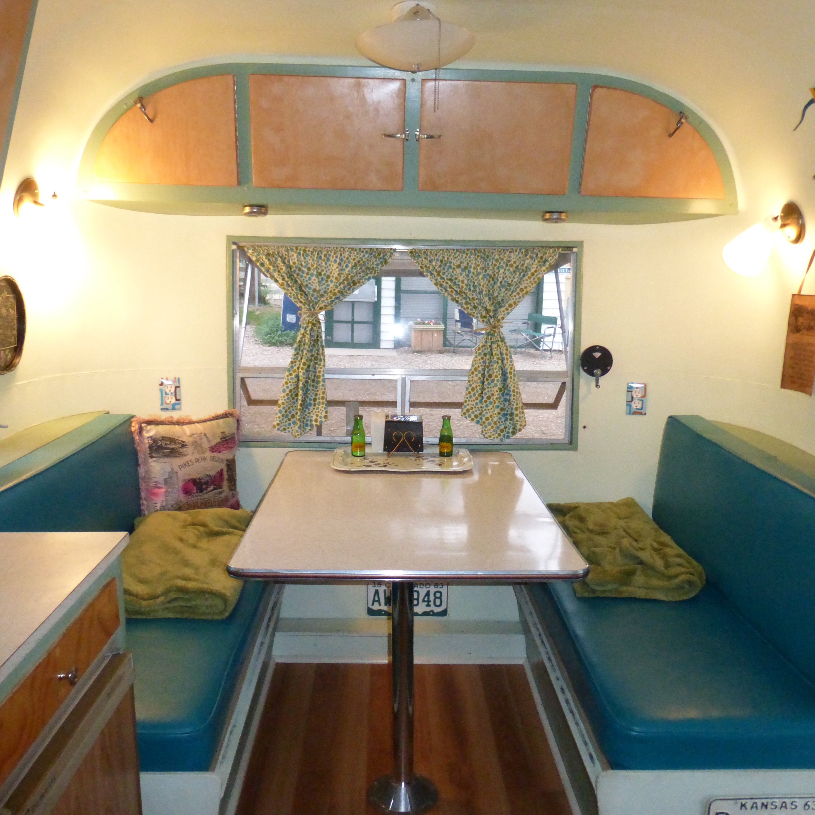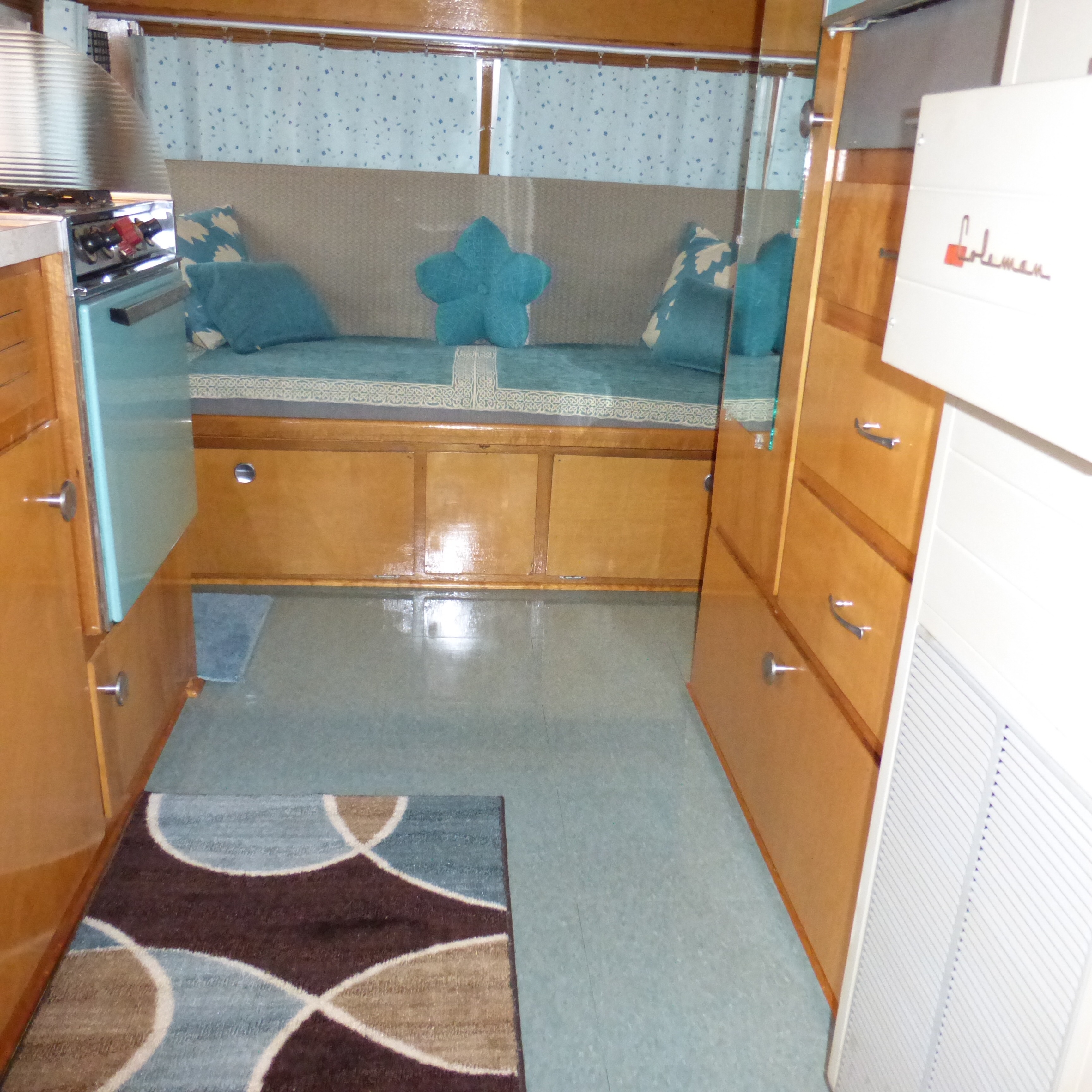 The counter top laminate is a custom design. I made the design based on Franciscan Starburst and WilsonArt printed it for me. It was expensive, but I saved much $$$ on fabric and upholstery. It was my splurge. Dear Husband’s splurge was installing roof top AC. During the hottest camping trip in the world to Hades, er….I mean Canon City, he was scarred for life.