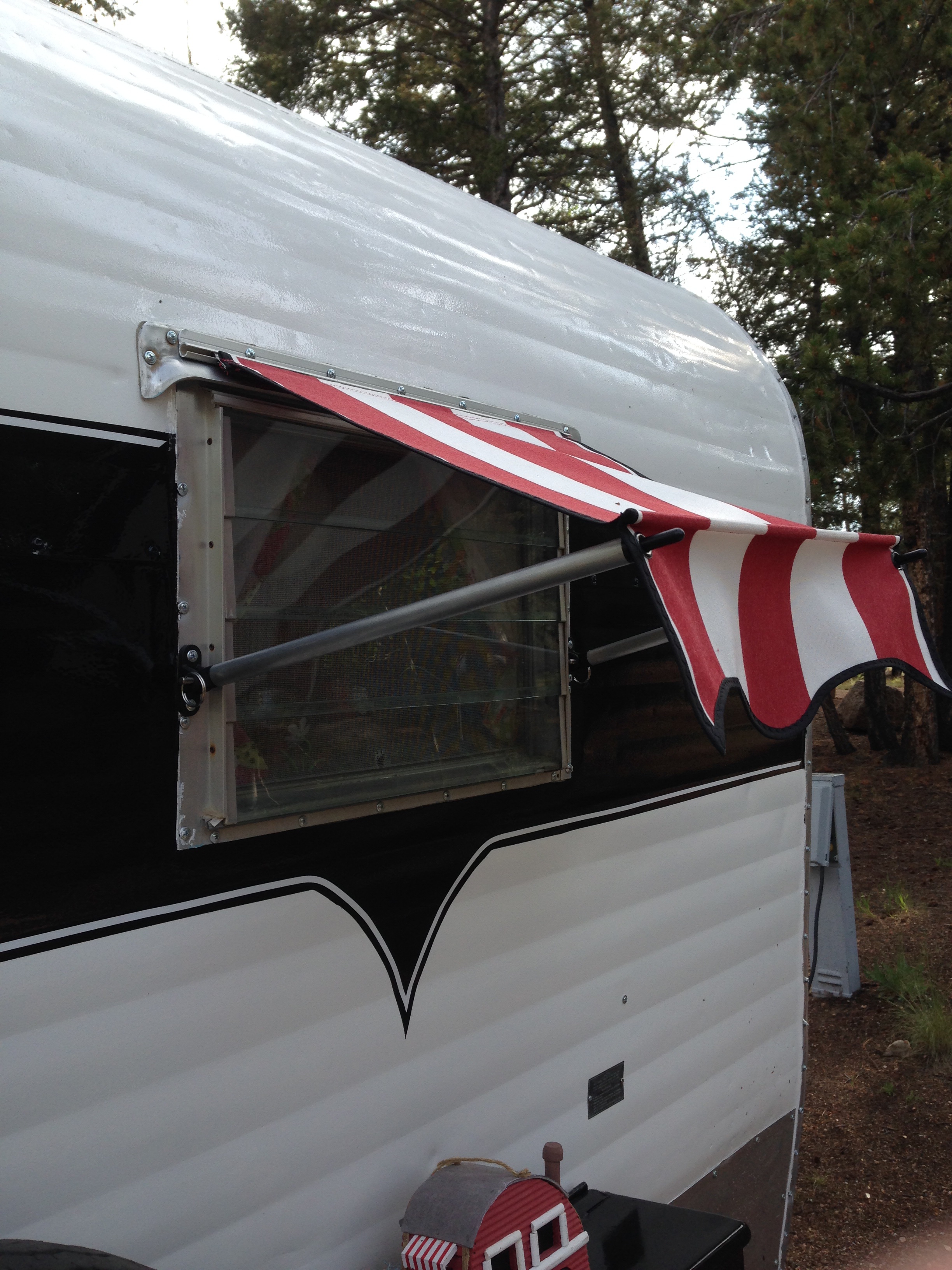 The window covers I made for Midge are cute, but they are on the actual glass, and if it rains or gets chilly, we have to close them and leave the covers on or remove them to tightly latch the windows closed. Hmmmmm….thinking, thinking, thinking….how can I make window awnings like the Nomad?? I feel a winter project coming on.